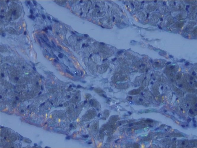 Амілоїд має структуру β-складки і виглядає білуватим, однорідним, прозорим і жирним при мікроскопічному дослідженні.